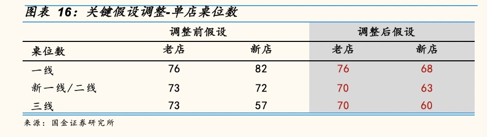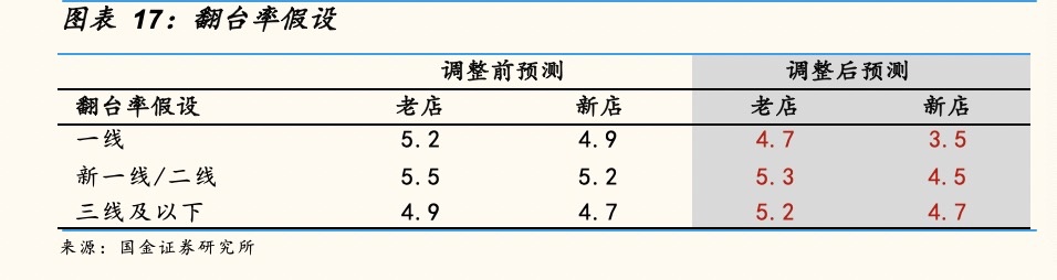 调整翻台率的预测。我们依然维持1000多家门店天花板的预测不变,但根据前文翻台率测算的结果略作调整,调低了一线城市门店的翻台率假设,但对一些门店数量尚处于安全区间的城市则结合门店大小趋势作相应调整。