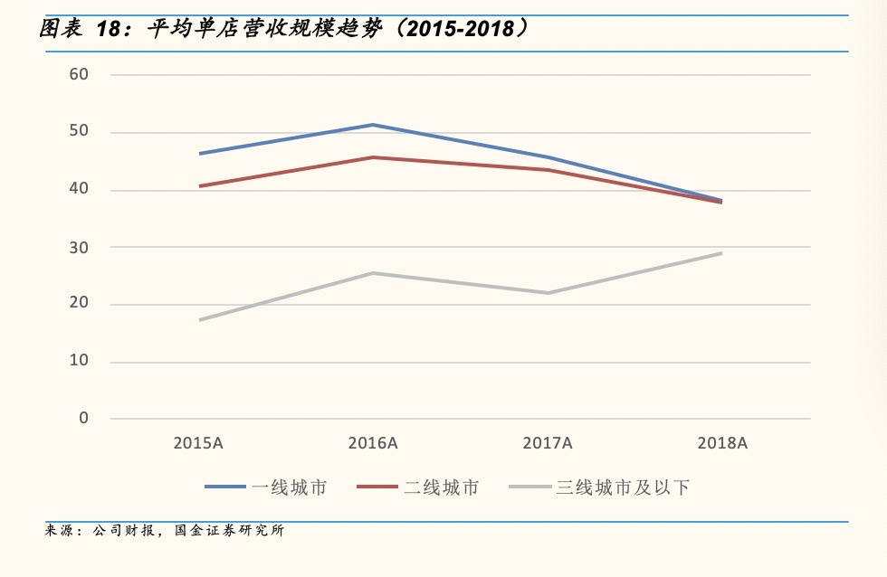 同时结合过年三年单店平均营收的趋势来看,由于门店面积变小以及新店营业时间稀释等因素,一、二线城市的单店收入规模呈下滑趋势,我们认为短期内平均单店营收下降的趋势将继续。