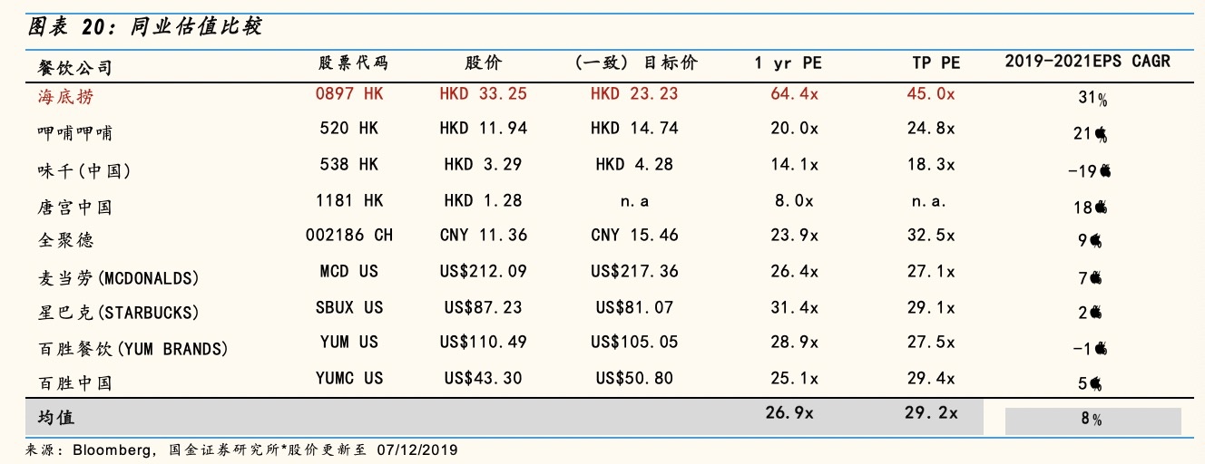 结合同业PE来看,我们认同短期门店增长的确定性以及餐饮品牌的强势影响力能给与海底捞一定估值溢价。但从目前市场一致预期测算,目前的股价隐含市场对公司未来三年50-60%的净利润复合增速预期(假设 PEG=1),我们认为这个增速实现的概率不大。
