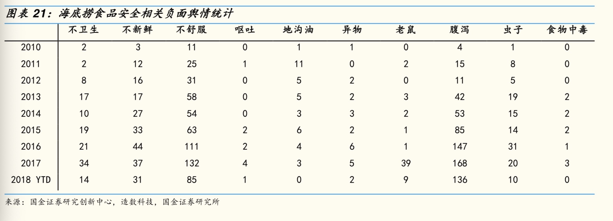 1)食品安全。对于所有的餐饮企业,食品安全都是主要的风险之一。海底捞所在的火锅行业,食用方式以短时间的煮涮为主,对于食材的品质和新鲜度的要求更高,面临的风险也越大。我们通过语义分析技术对海底捞顾客的舆情做了提取分析,可以看出与食品安全相关的负面点评在绝对数上呈现增长趋势。但是由于海底捞每年新增店面数和人流量近年来同步快速上升,2015-2017年整体的负面舆情占比均不超过0.15%。尽管海底捞一直重视食品安全并有完善的应对流程,一旦有较大规模的食品安全黑天鹅事件,对于公司的品牌和经营业绩均可能产生明显的冲击。