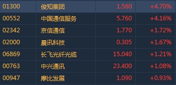 智通财经APP获悉,5G概念随A股集体走高,俊知集团(01300)领涨板块。截至13时34分,俊知集团涨4.7%,报价1.56港元,中国通信服务(00552)涨4.16%,京信通信(02342)涨1.72%,中心通讯(00763)涨1.08%。