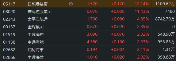 智通财经APP获悉,港口航运股午后走强,日照港裕廊(06117)升12.14%领涨,太平洋航运(02343)涨4.85%,中远海控(01919)、中远海能(01138)、中远海发(02866)涨超2%。