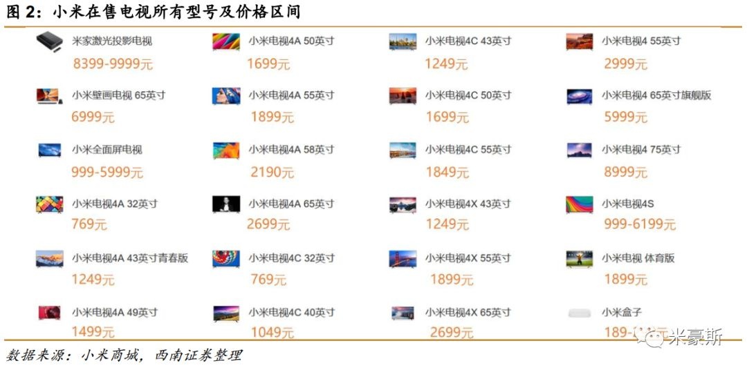 小米电视:小米大家电战略核心品种。小米电视作为小米大家电战略的核心品种。从2013年9月首发至今已发布了四代产品,涵盖从32英寸到75英寸、从769元到9999元的各个种类。2019Q1小米电视出货量达到260万台,同比保持翻倍高速增长,连续两个季度出货量保持中国大陆市场份额第一。