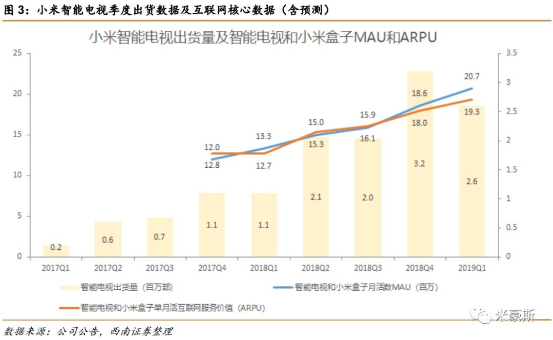 在互联网服务变现核心指标月活数(MAU)方面,2018年底,小米电视和小米盒子月活数达到1860万;2019年一季度末月活数达到2070万,ARPU值(TTM)约65.1元。