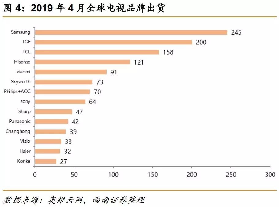 根据奥维云网数据,2019年1-4月,小米电视全球出货量已超越索尼,排名全球前五。其中最新数据显示,2019年4月全球电视品牌共出货1555万台,同比下降5.9%,环比下降4.9%。受备货节奏影响,中国区与海外出货同比分别下降11.2%和4.1%。其中,北美出货同比增长2.9%,增速减缓;亚太出货同比增长0.5%,日本出货有所回升;其余区域出货均有较大幅度下降。