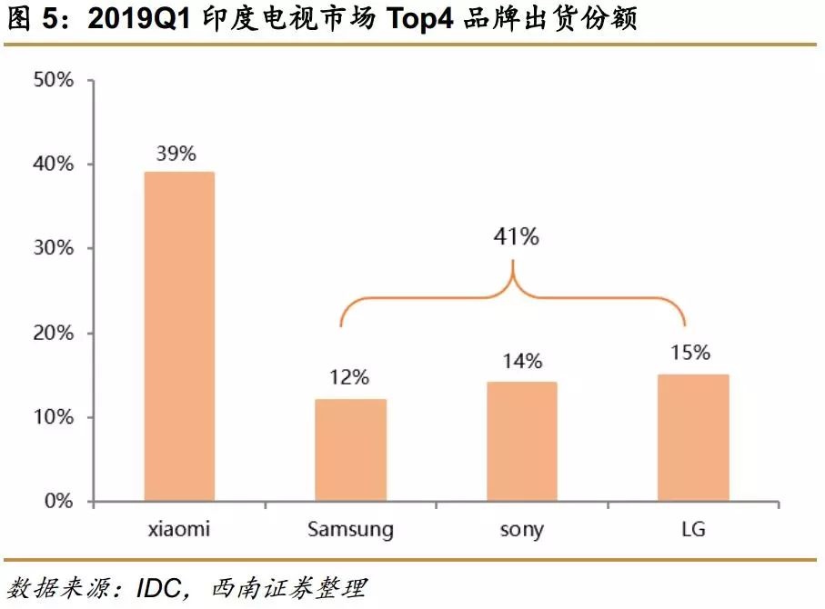 印度:小米智能电视于2018年2月进入印度市场,仅用14个月在印度的出货量突破200万,成为印度领先的智能电视品牌。根据IDC数据,2019年一季度小米电视在印度的市场份额接近40%,约等于排名第二三四品牌市场份额的总和。