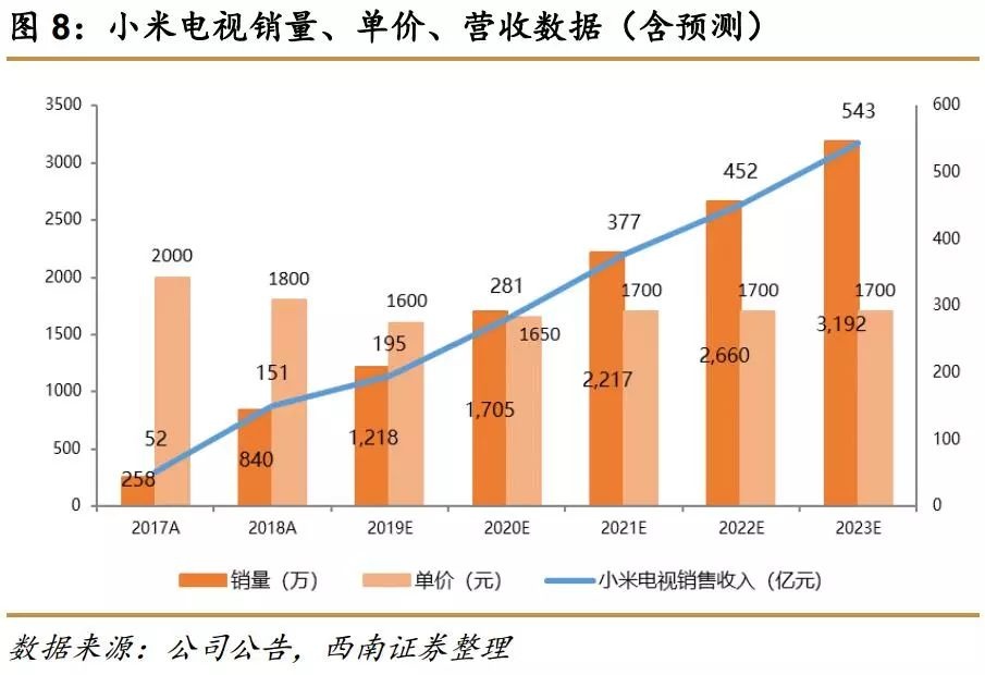综合预测小米电视未来五年销量增速由高速逐步趋稳至20%左右,单价维持在1700元上下,2023年销售规模有望突破500亿。