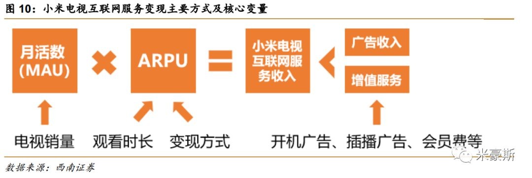 小米电视的变现潜力:从ROKU来看。在小米互联网服务收入多样化的确定趋势下,小米电视的互联网服务将是未来小米互联网服务的核心增量之一。我们分析了小米电视互联网服务变现的主要方式(广告收入和增值服务)和核心变量(MAU和ARPU),并对小米电视的MAU和ARPU值进行合理预测: