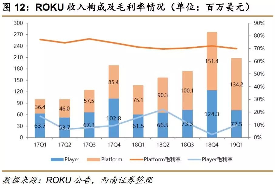 ROKU目前的收入主要分为两个部分:平台收入(Platform)和播放器收入(Player),其中平台收入是主要收入部分且毛利率水平显著高于播放器收入。平台收入又主要来自两个方面:来自对电视机OEM公司的授权费,通过收取少量授权费推广其电视机操作系统(Roku-powered TV);以及针对接入ROKU平台的消费者电视的平台收入,主要通过销售机顶盒或电视机棒将电视接入ROKU平台。