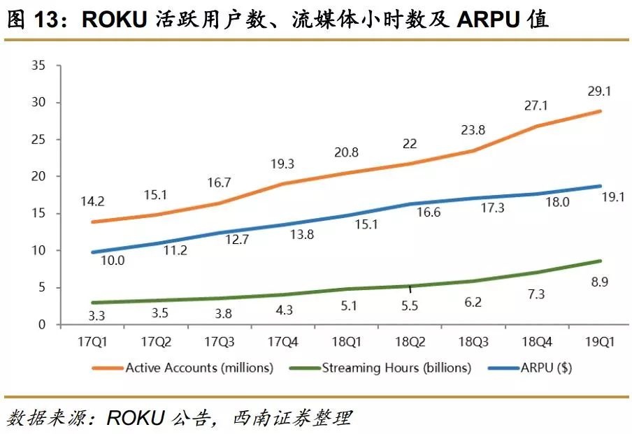 同样地,ROKU的商业模式也可以分解为活跃用户数、观看时长和ARPU值三个核心变量。截至2019年一季度,ROKU活跃用户数达到2910万,ARPU值达到19.1美元,流媒体小时数达到89亿。