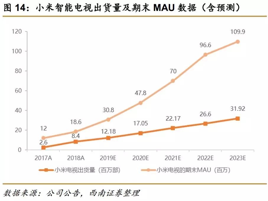 MAU:对于小米电视期末MAU的预测,我们作出如下推断:智能电视换机周期约5年,五年内期末MAU等于前一年期末MAU加上当年智能电视新增销量,超过五年后期末MAU等于前一年期末MAU加当年智能电视新增销量再减去五年前期末MAU值,五年前的智能电视进行淘汰换机)。