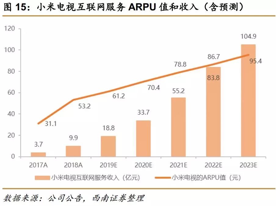 MAU预测以5年换机周期作为主要假设前提,ARPU值则对标ROKU验证小米电视的成长空间。最后我们预计到2023年,小米智能电视潜在出货空间3000万台,对应小米电视的MAU值将超过1亿,ARPU值达到约95元,小米电视互联网服务潜在变现空间至少100亿(2018年智能电视互联网服务收入约10亿元)。