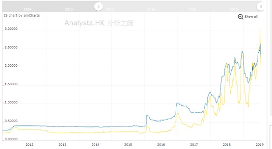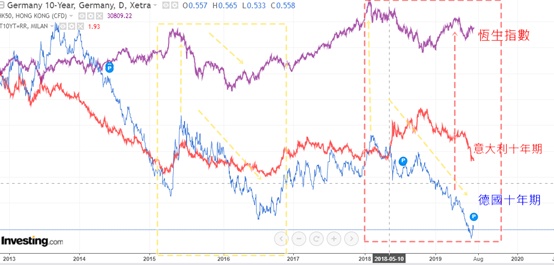 读者可见,德国债息十年期见顶的时间(由2015年开始到今天)也表示恒生指数见顶的时间,直到德国债息出现负利率后一段时间,恒生指数才会见底。这暗示全球资金与避险有关。