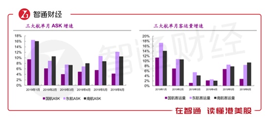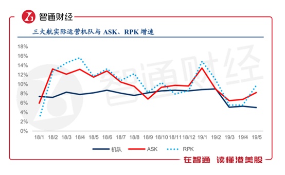 行业数据、航企经营数据的回暖,将缓慢扭转悲观情绪。智通财经APP了解到,今年上半年民航全行业完成运输总周转量627.6亿吨公里,同比增长7.4%;全行业共完成旅客运输量3.2亿人次,同比增长8.5%;全行业共完成货邮运输量351.2万吨,同比下降1.3%。虽对比2018年上半年同期13%、12.4%、6.4%的增速有回落,但是依旧保持较为强劲的正增长。同时,在航司4月经营数据出现波动的情况下,5月、6月经营数据回暖说明行业并未进入所谓的“下降通道”。