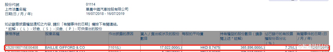 智通财经APP获悉,根据联交所资料显示,股东Baillie Gifford于7月12日增持华晨中国(01114)1702万股,每股作价8.75港元,总值约1.49亿港元,最新持股数目3.66亿股,最新持股比例为7.25%。