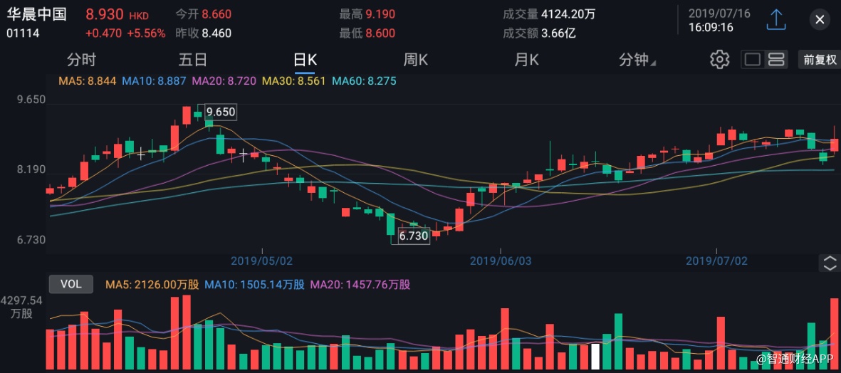 截至今日收盘,华晨中国(01114)涨5.56%,报8.93港元。