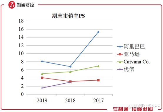 从图中对比可以看到,净利率超过20%的阿里巴巴高居榜首,净利率较低的亚马逊则要逊色不少。而同为二手车电商并且处于未盈利状态的Carvana Co.,2019年PS也达到了5,同期优信的PS则只有不到1.6。