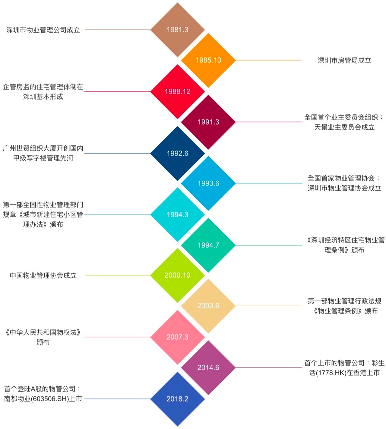 上世纪80年代,随着改革开放的脚步,物业管理也从香港引入到深圳,并逐步向内地延伸,我国物管行业的发展历程如下: