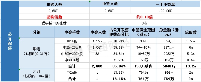 其中,公开配售申购人数2687,一手中签率100%,超购倍数约0.18倍。