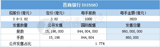 智通财经APP获悉,7月17日,晋商银行(02558)配售结束。配售招股价区间为3.8-3.82港元,最终定价3.82港元,每手3820港元。