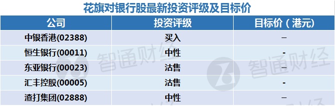该行指出,香港银行中,首选中银香港(02388),给予“买入”评级;给予恒生银行(00011)“中性”评级;给予东亚银行(00023)“沽售”评级。国际银行中,给予汇丰控股(00005)“沽售”评级,渣打集团(02888)则近期被降至“中性”评级。