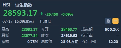 智通财经APP获悉,恒指早盘低开0.54%,报28463.77点。截至收盘,恒生指数跌26.45点或0.09%,报28593.17点,全日成交额达600.21亿。国企指数跌0.16%,报10847.91点,红筹指数跌0.38%,报4447.48点。