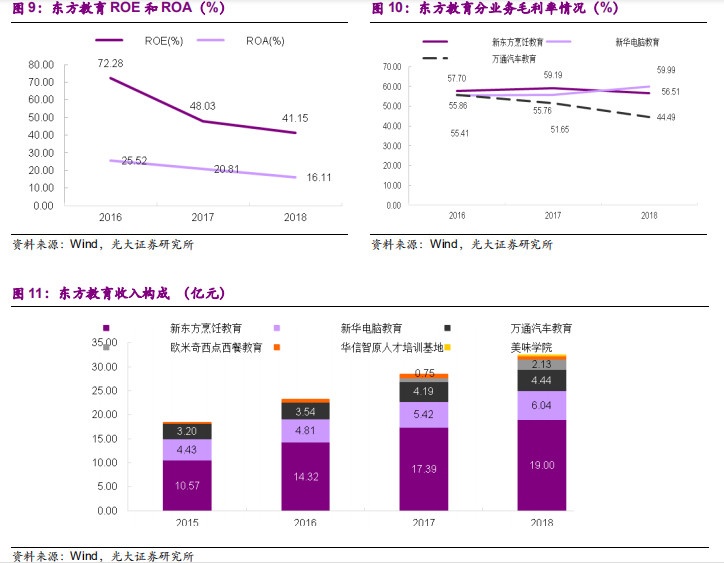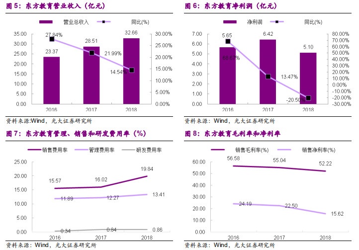 东方教育2018实现营收32.66亿元,同比增长14.54%;实现净利润5.10亿元,同比增长-20.50%。东方教育2016-2018年收入增速分别为27.84%/21.99%/14.54%,净利润增速分别为68.67%/13.47%/-20.50%,收入和净利润增速逐年下滑主要是因为公司在2017-2018年新开校区数较多,前期投资较大,新校区到成熟校区的爬坡周期一般为2-3年。