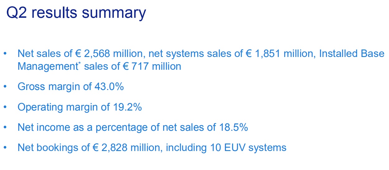 财报显示,期内,阿斯麦每股收益为1.13欧元,较Q1增长34.5%,远高于市场普遍预期的每股0.95欧元;净销售额为25.68亿欧元,较Q1增长15.2%;净利润占净销售额的18.5%,即4.75亿欧元;利润率提高140个基点,至43%,超过了今年早些时候的预期;营业利润率为19.2%;净预订为28.28亿欧元,包括10个EUV系统。