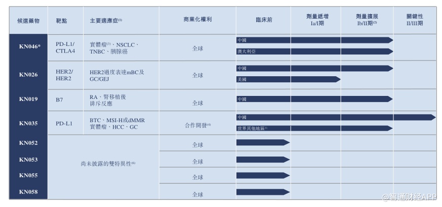 至于KN046,是一种BsAb免疫检查点抑制剂,同时靶向两个临床验证的免疫检查点PD-L1及CTLA-4,为潜在突破性的新一代肿瘤免疫特效药。目前在澳大利亚及中国进行的I期临床试验,无上市时间表。而KN019,是一种基于CTLA-4的免疫抑制剂融合蛋白,将在今年8月开始RA的II期试验,也无上市时间表。