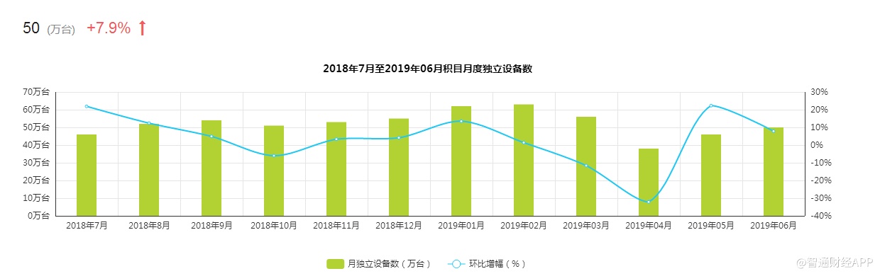 查看第三方机构网站,积目的用户并没有市场传闻的那么高。其中,艾瑞咨询数据显示,在过去的12个月中,积目最高时的月独立设备数在今年2月,但仅有63万台。而易观千帆则因为积目用户太少未纳入统计范围。