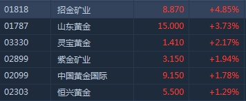 智通财经APP获悉,受美元指数走弱影响,国际金价再度攀升,港股黄金股集体跟涨。截至9时46分,招金矿业(01818)涨4.85%,报价8.87港元,山东黄金(01787)涨3.73%,紫金矿业(02899)涨1.94%,中国黄金国际(02099)涨1.78%,恒兴黄金(02303)涨1.29%。