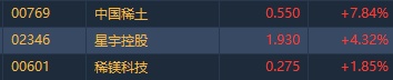 智通财经APP获悉,A股稀土板块逆市拉升,焦作万方涨停,中钢天源涨近6%,港股稀土概念股跟随走强。截至发稿,中国稀土(00769)涨7.84%,星宇控股(02346)涨4.32%,稀镁科技(00601)涨1.85%。