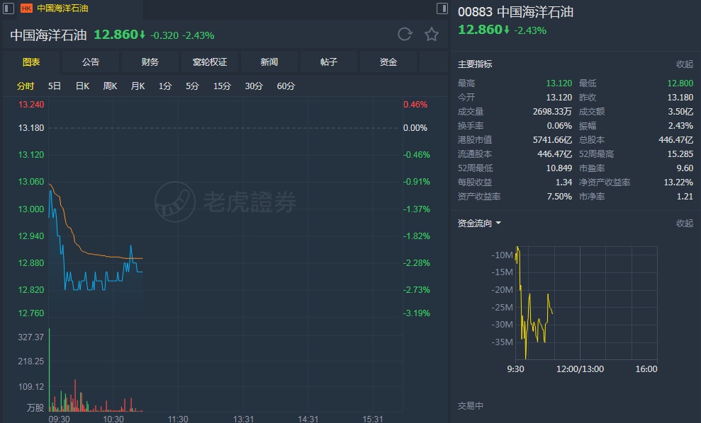 智通财经APP获悉,大和发表研究报告指出,下调中海油(00883)投资评级,由原来“跑赢大市”降至“持有”,将目标价由15.7港元降至13.8港元,此相当预测市账率降至1.17倍(此前予1.3倍),反映对国际油价疲弱走势的预期。