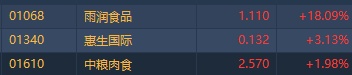 智通财经APP获悉,近期猪肉概念股持续走强,截至发稿,雨润食品(01068)升18.09%领涨,惠生国际(01340)涨3.13%,中粮肉食(01610)涨1.98%。