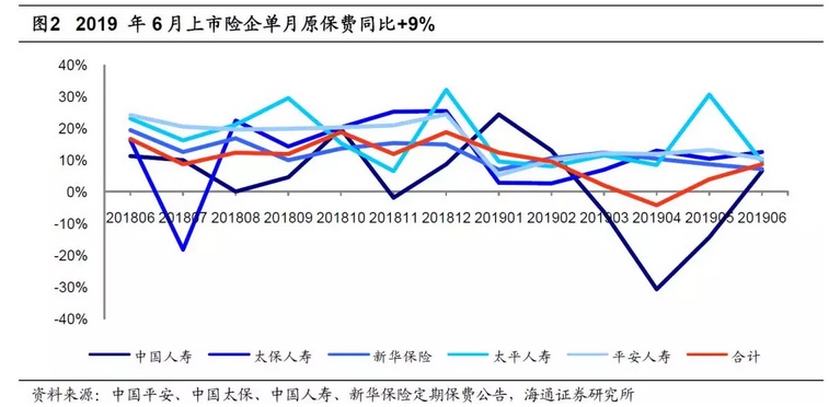 6月上市险企保费增速持续回暖,同比+9%;国寿保费高基数影响逐月减弱,6月单月增速转正。上市险企4月、5月单月保费分别同比-4%、+4%,6月单月保费同比+9%,在增员、强训的严格落实下,保费增速逐月回暖。国寿、太保6月保费分别同比+7%、+13%,较5月明显好转,国寿同比增速由负转正;平安、新华、太平单月增速分别为+10%、+7%、+10%,平安、新华6月保费同比增速较5月分别下滑1ppt、3ppt,太平下滑21ppt,主要是由于5月受“福禄康瑞”停售影响保费同比增速大幅领先同业。上市险企1-6月累计保费同比增长+7%,18年同期保费同比+11%。