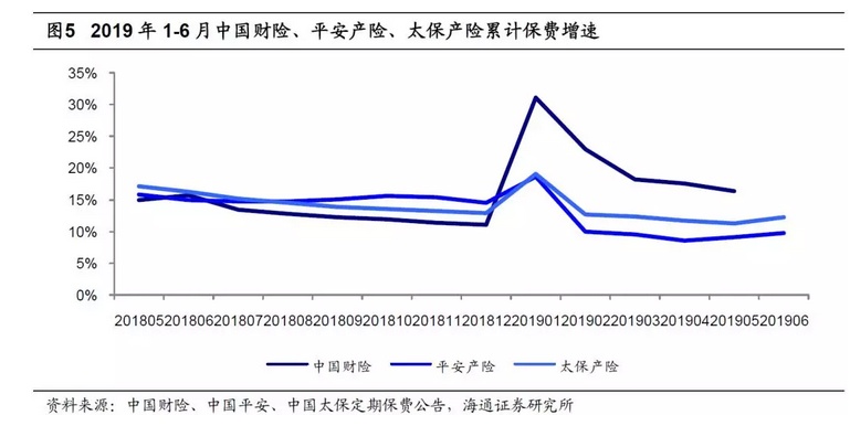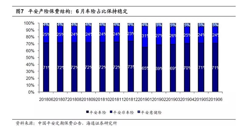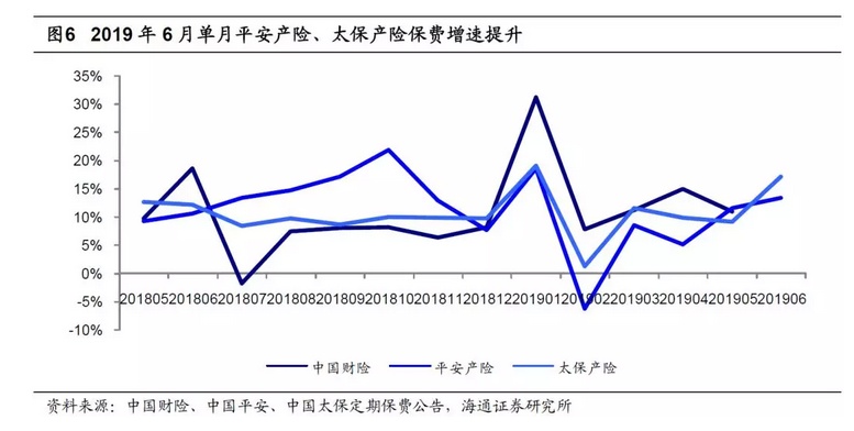 龙头产险企业6月保费增速为2月以来单月最高,平安产险6月保费增速较5月小幅提升、太保增速上行8ppt。1)平安产险、太保产险6月单月保费同比增速分别为+13%、+17%,平安产险同比增速较5月小幅提升,太保产险较5月的同比增速上行8ppt。2)平安6月车险、非车险、意健险分别同比+10%、+18%、+36%,车险增速较5月提升3ppt;1-6月车险、非车险、意健险分别同比+9%、+7%、+39%。3)我们预计19年产险行业受新车销量增速下滑影响,保费增速难有大幅改善;车险将从保费竞争进一步转向服务竞争,各险企将着力于提高续转保率以抵消新车业务下滑带来的负面影响。非车险将在责任险等险种高速增长的带动下整体维持较高增速。4)受商车费改政策的持续影响,我们预计上半年各产险公司综合成本率同比有所上升,其中综合费用率预计维持高位,但手续费及佣金率预计小幅下降,赔付率或有上行压力。新规实施后税收调减,预计人保财险等净利润将有显著提升。我们认为19年在“报行合一”的进一步落实下,手续费率有望进一步下滑,或将影响未到期责任准备金计提规模从而促进已赚保费形成率提升,行业整体综合成本率年内有望改善。