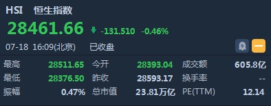 智通财经APP获悉,恒指早盘低开200.13或0.7%,报28393.04点。截至收盘,恒生指数跌131.51点或0.46%,报28461.66点,全日成交额达605.87亿。国企指数跌0.58%,报10784.55点,红筹指数跌0.46%,报4427.22点。