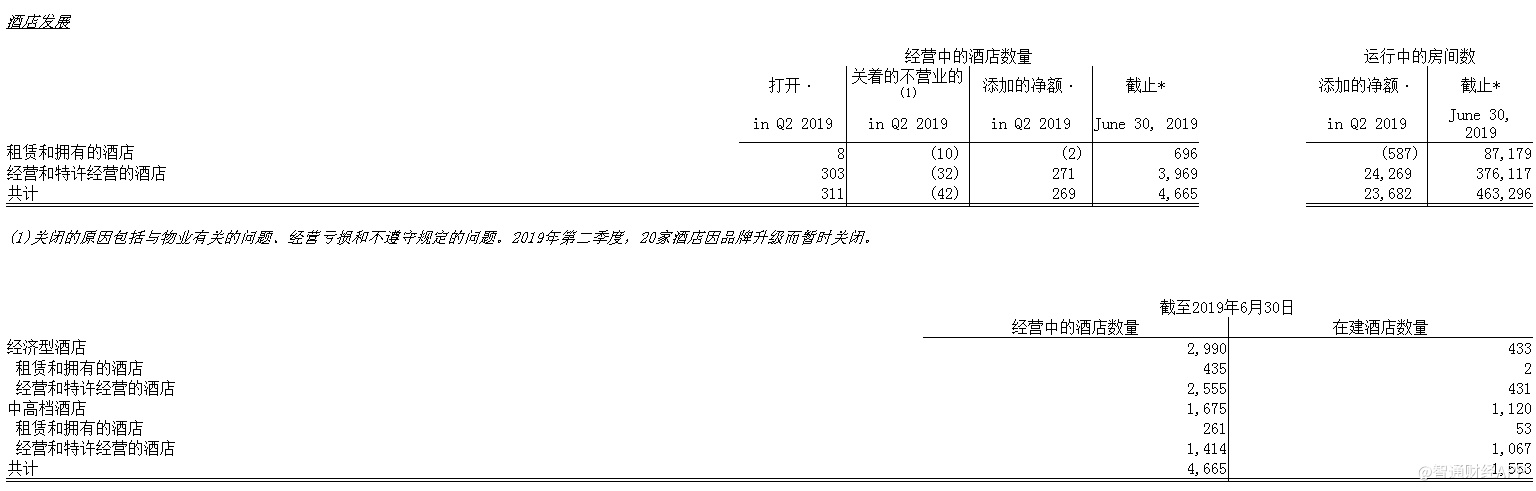 具体来看,租赁和自有酒店数量为696家,其中新开设8家,关闭10家,净减少2家;租赁和自有酒店的客房总数为87179间,净减少587间。特许经营酒店为3969家,其中新开303家,关闭32家,净增271家;特许经营酒店的客房总数为376117间,净增24269间。