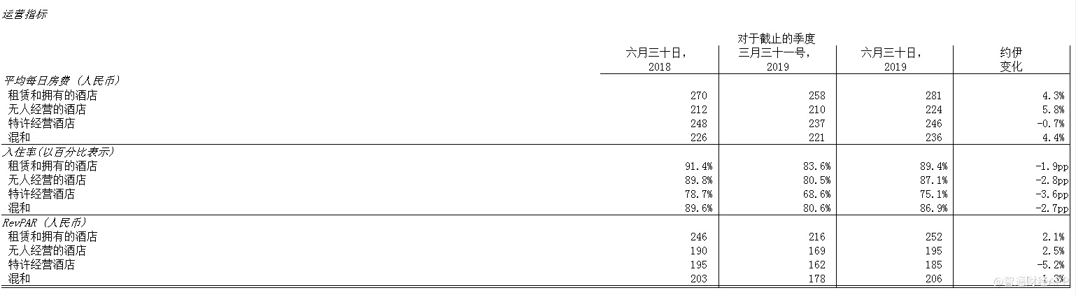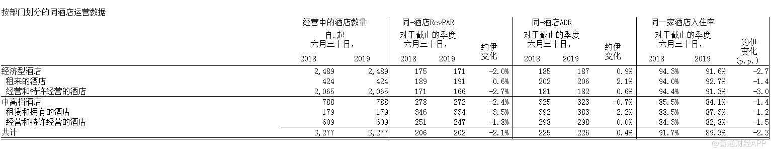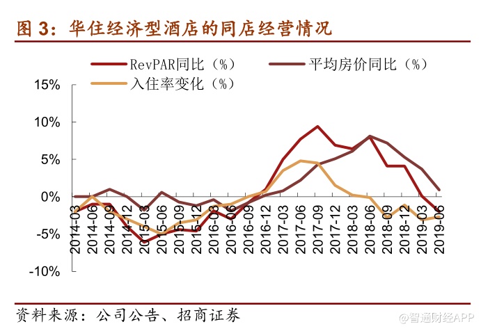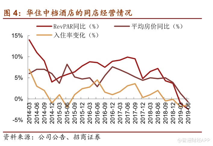 另一方面是,中档入住率下跌,平均房价首次下滑,RevPAR进一步下挫。据智通财经APP观察,2019年第二季度,华住的成熟中档酒店同店入住率为84.1%,同比下滑1.4%,平均每日房费为323元,同比下滑0.7%,为2014年以来的首次下滑,最终导致 RevPAR(每间可销售房收入)同比下滑2.4%。