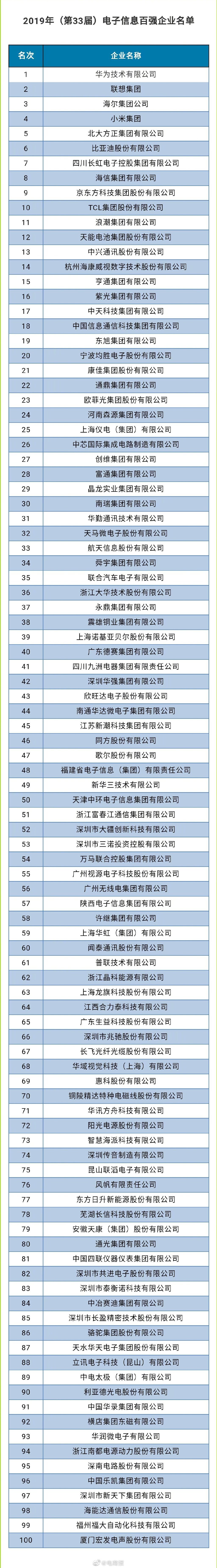 智通财经APP获悉,7月18日,中国电子信息行业联合会发布了2019(第33届)电子信息百强企业名单。其中,华为连续十二届位居榜首,联想(03396)、海尔(01169)分列二三位。这三家企业主营业务收入均超过2500亿元。位列榜单4至10位的企业是小米(01810)、北大方正、比亚迪(01211)、长虹、海信(00921)、京东方、TCL。