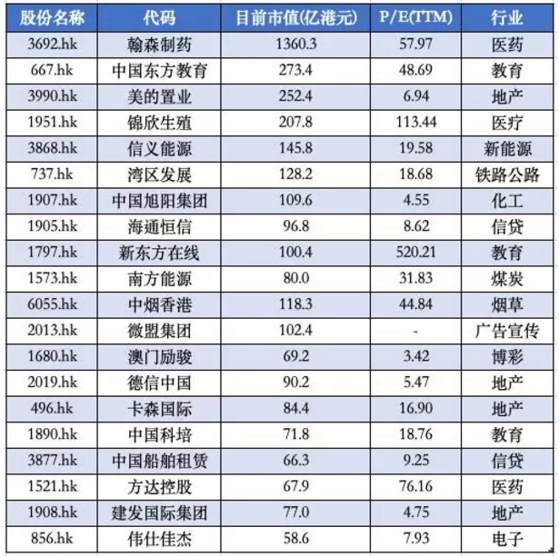 这20只股份分别为:翰森制药(03692)、中国东方教育(00667)、美的置业(03990)、锦欣生殖(01951)、信义能源(03868)、湾区发展(00737)、中国旭阳集团(01907)、海通恒信(01905)、新东方在线(01797)、南方能源(01573)、中烟香港(06055)、微盟集团(02013)、澳门励骏(01680)、德信中国(02019)、卡森国际(00496)、中国科培(01890)、中国船舶租赁(03877)、方达控股(01521)、建发国际(01908)、伟仕佳杰(00856)。