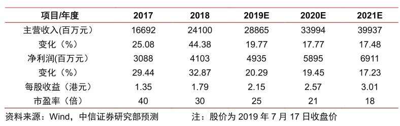维持2019/2020/2021年EPS预测1.84/2.20/2.57元(对应2.15/2.57/3.01港元),维持“买入”评级,对应2019年25倍PE。