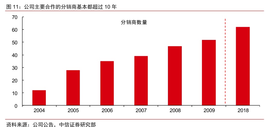(1)经销商:关系清晰,独立经营,且具备一定盈利能力。公司对分销商背景有严格的筛选标准,目前合作超过 60 个经销商,大部分为合作很久、关系稳定的分销商 。从公司发展的历史来看,早期依赖熟悉的人来承担分销角色,确实有部分相关人士在分销商有持股,但公司都按照上市规则正确处理。而关于分销商的利润率问题,据我们的跟踪判断,公司合作的成熟的经销商基本普遍维持较好的盈利能力。