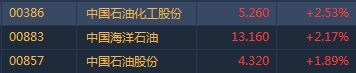 智通财经APP获悉,国际油价止跌反弹逾2%,港股石油股集体跟涨,截至11时36分,中石化(00386)涨2.53%,报价5.26港元。中海油(00883)涨2.17%,中石油(00857)涨1.89%。