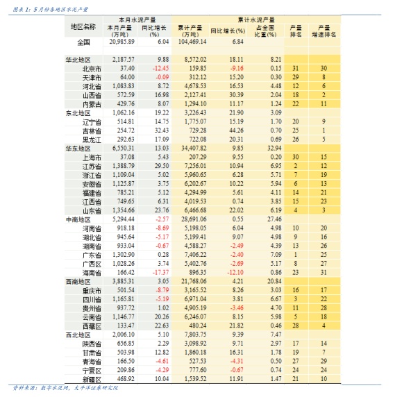 事件:1-6 月全国水泥产量 10.45 亿吨,同比增长 6.84%,其中 6月单月水泥产量 2.1 亿吨,同比增长 6.04%;分地区来看,1-6 月份华北地区产量累计增长 18.11%,东北地区增长 21.90%,华东地区增长 9.85%,中南地区增长 0.55%,西南地区增长 4.21%,西北地区增长 9.39%。