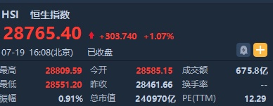 截至收盘,恒生指数涨303.74点或1.07%,报28765.4点,全日成交额达675.85亿。国企指数涨1.16%,报10909.41点,红筹指数涨0.62%,报4454.56点。