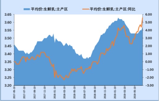 2019年上半年,原奶价格继续上涨,同比涨幅在2%到3%之间,环比来看,奶价比2018年提前一个月开始回升。乳制品方面,生鲜乳价格幅波动明显,截止2019年6月26日,主产区生鲜乳平均价为3.57元/千克,同比增长5.6%。7月3日,主产区生鲜乳平均价保持在3.57元/千克,但同比涨幅达到5.9%。
