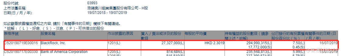 智通财经APP获悉,根据联交所资料显示,贝莱德于7月16日减持洛阳钼业(03993)2733万股,每股作价2.30港元,总价值约6291万港元,最新持股数减至2.95亿股,最新持股比例减至7.5%。