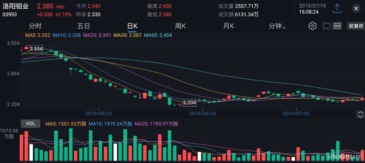 截至今日收盘,洛阳钼业(03993)涨2.15%,报2.38港元。