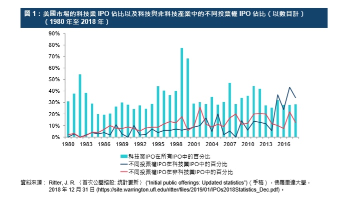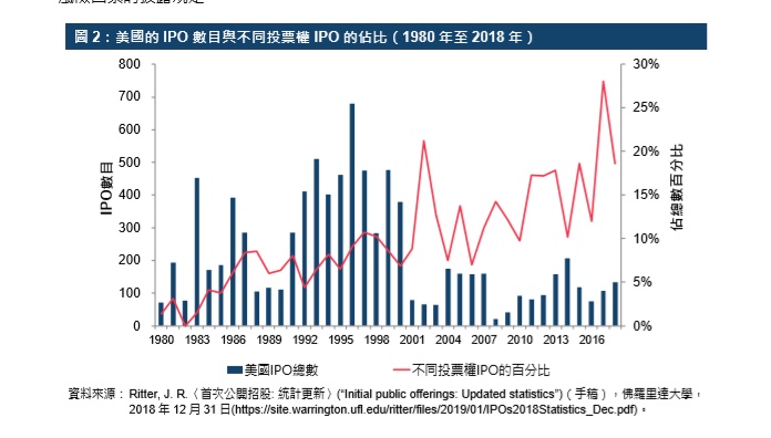 因此,接受不同投票权公司的上市制度正好切合科技及创新产业公司的需要。根据普华永道的资料,2017年全球共有100宗科技业IPO,合共筹得251亿美元的资金。另一资料来源则显示在美国所有IPO活动中,科技公司约占36%,而不同投票权科技公司的IPO的占比在2017年更升至43%的历史新高,2018年则回落至34%。